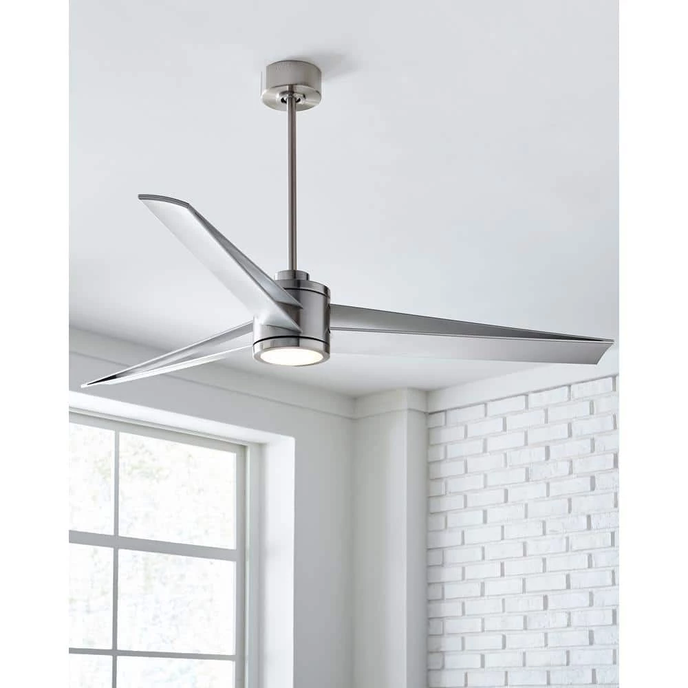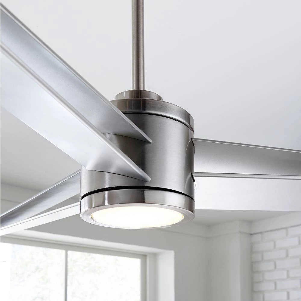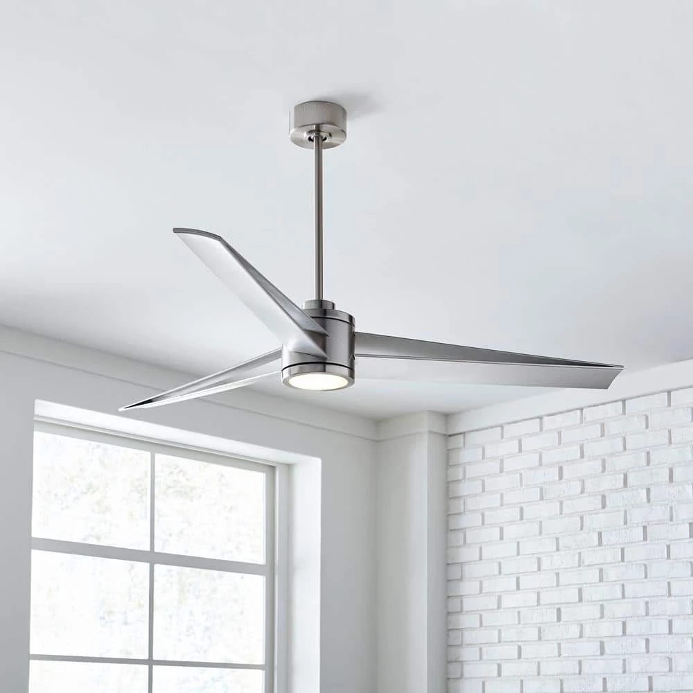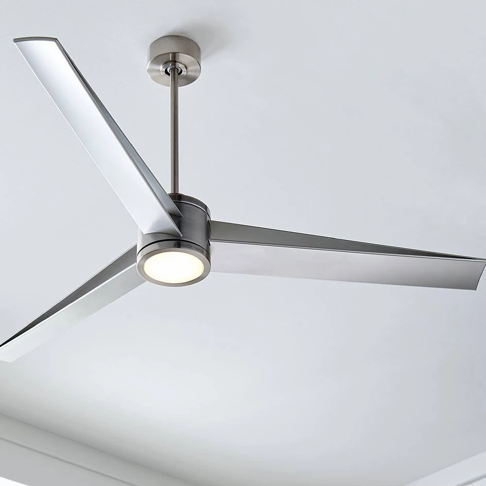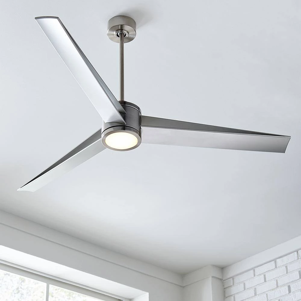 The Armstrong flush mount ceiling fan’s unique design, with 6 blades meeting in three different points, sets this contemporary fan’s style apart from its competition. Armstrong is Damp-Rated and has an energy-efficient DC motor. It includes a hand-held remote control with 6-speed and reverse functionality.