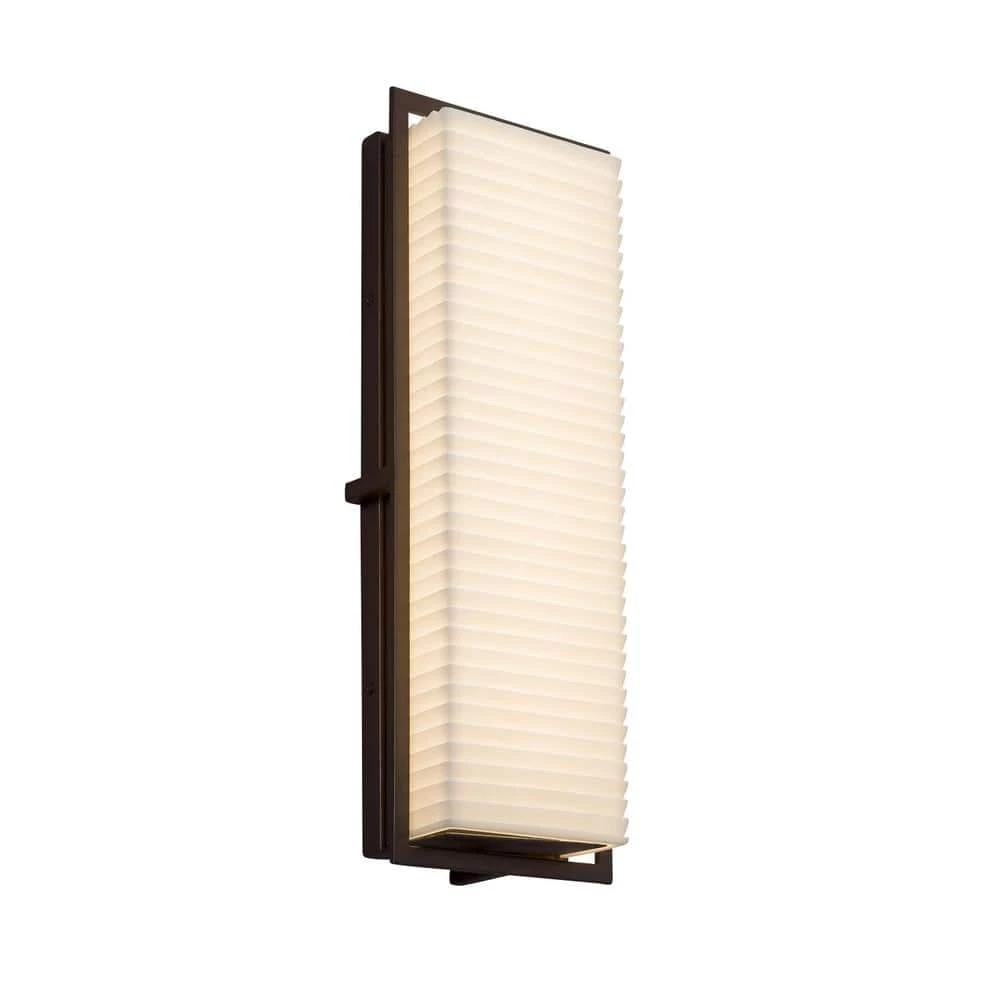 The Porcelina Collection was created to offer large-scale lighting fixtures that coordinate with our extensive Limoges Collection of translucent porcelain. The sculpted surfaces of these faux porcelain shades capture the classic, yet contemporary, designs of the delicate “Impressions” of the Limoges Collection. This Porcelina Avalon outdoor integrated LED wall mount comes in a dark bronze finish with a sawtooth shade. A transitional style fixture by Justice Design, perfect for any outdoor space.