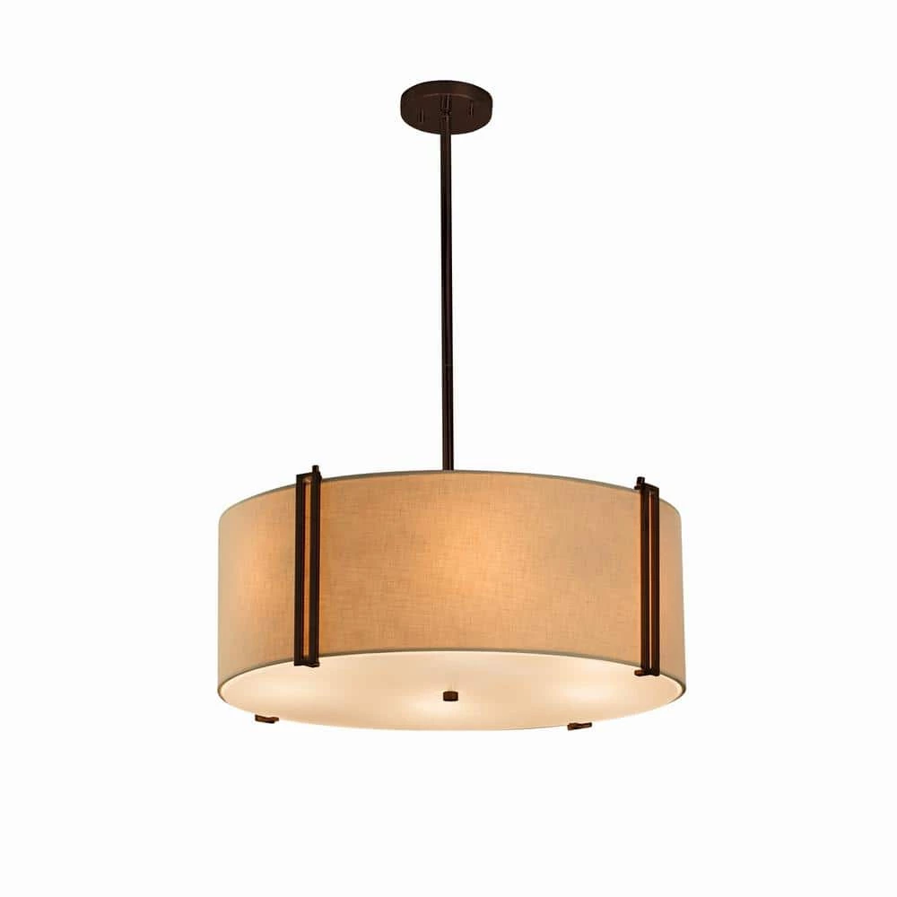The subtle textures of our linen weaves give our Textile shades a naturally rich look. They pair well with all of our fixture families and elevate the look of a room. This Textile Reveal pendant comes in a dark bronze finish with a cream shade. A craftsman style fixture by Justice Design, perfect for any dining room or foyer.
